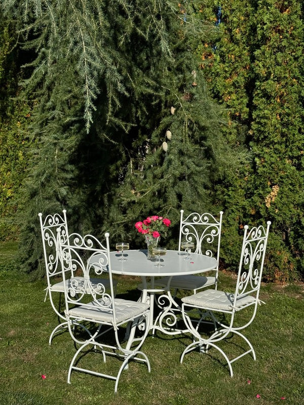 Franse smeedijzeren eettafelset Coco ChanelFranse smeedijzeren eettafelset Coco Chanel met tafel en vier lelie-stoelen is een aanwinst voor binnen en buitenruimtes thuis, hotel of restaurants.