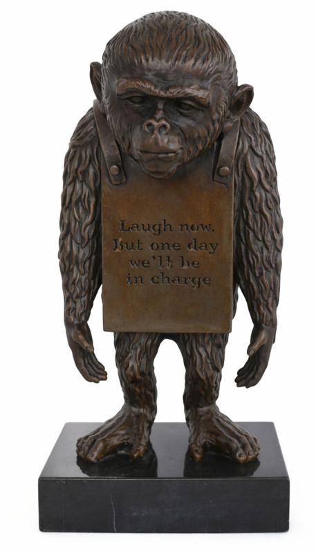 Banksy aap met tekst bronzenbeeldBanksyaap bronzenbeeld van de beroemde Britse graffitikunstenaar met de iconische tekst op zijn buik “Laugh now, but one day we’ll be in charge.”