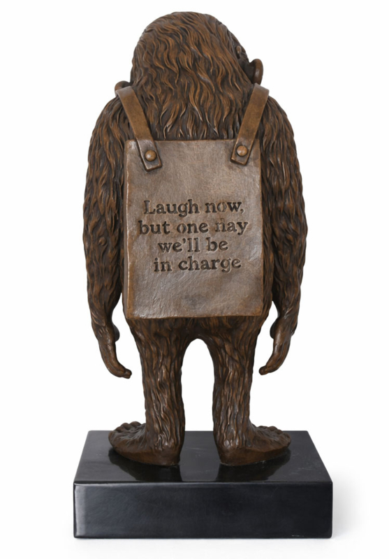 Banksy aap bronzenbeeld van de beroemde Britse graffitikunstenaar met de iconische tekst op zijn buik “Laugh now, but one day we’ll be in charge.”