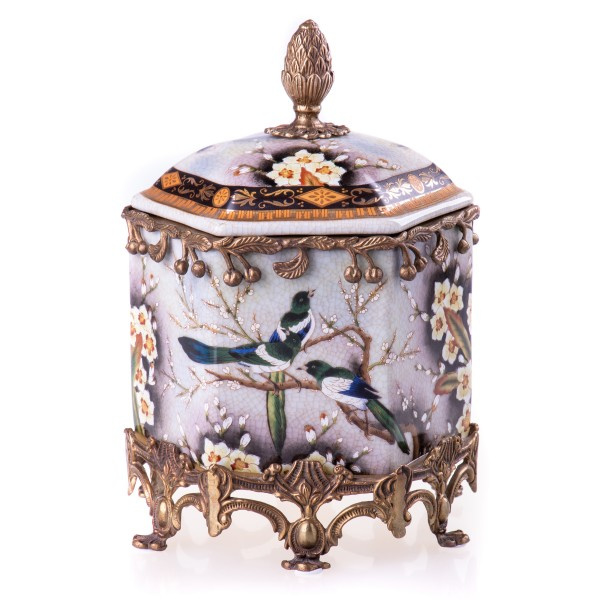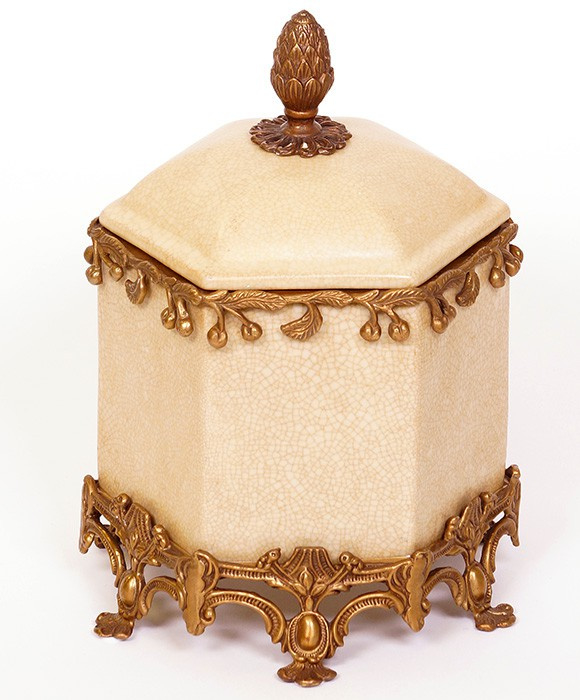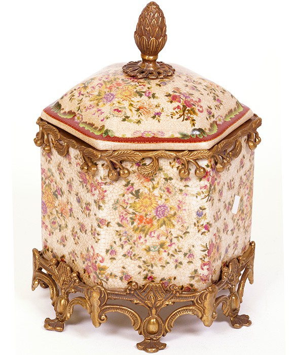 Boven op het dekseltje zit een bronzen dennenappel en de bonbonnieres hebben bronzen voetjes en bronzen versieringen rondom.