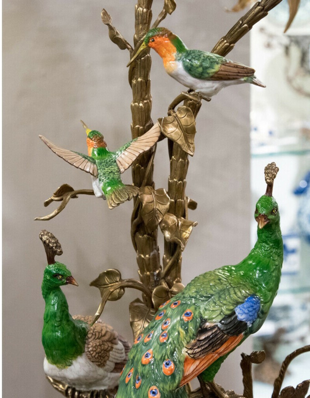 Porselein met bronzen vogel kunstwerk van pauwen en kolibrietjes en met diverse vergulde palmbomen in goudbrons is een ware eye-catcher in huis en horeca.