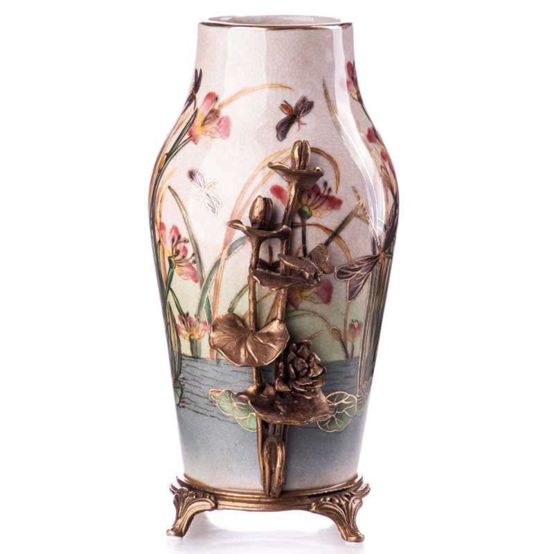 Beschilderd met mooie planten bloemen en libelle en omarmd versierd met bronzen bladeren en ranken als standaard voor de vaas.