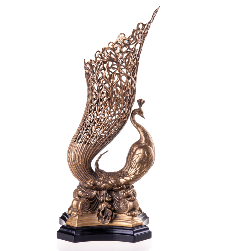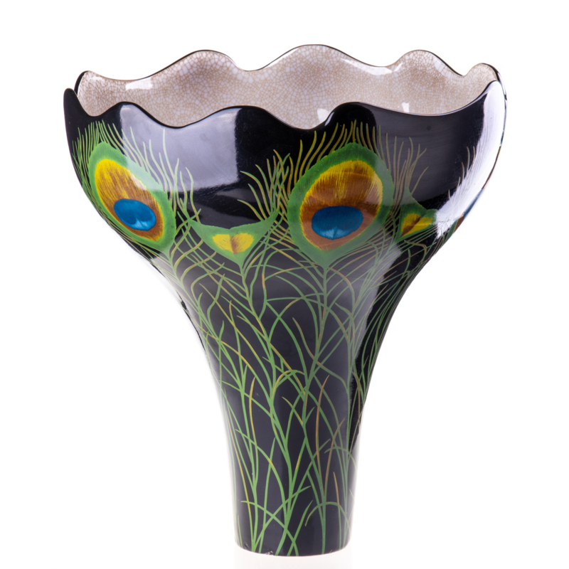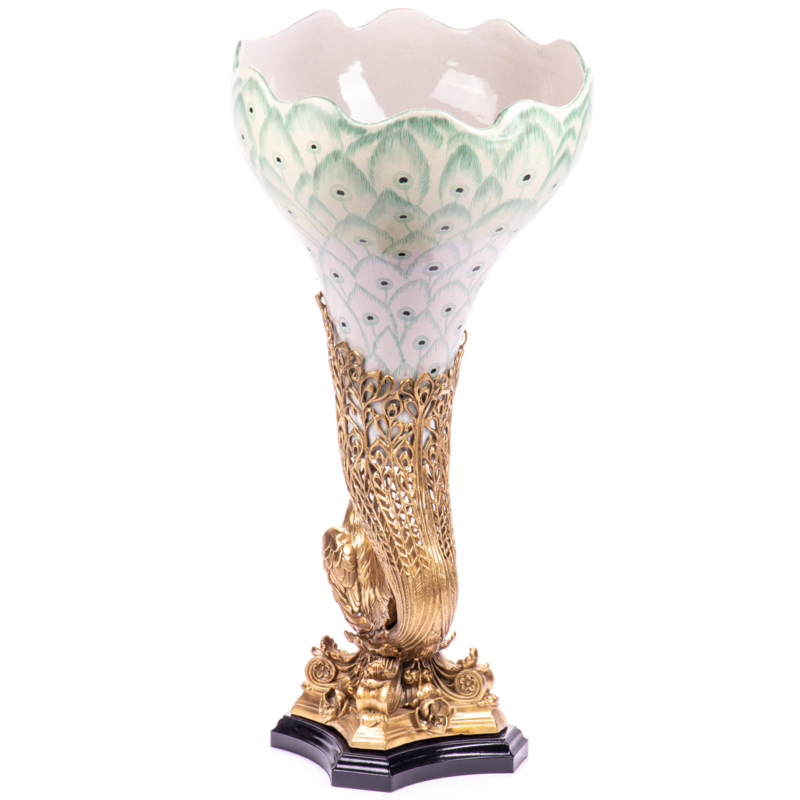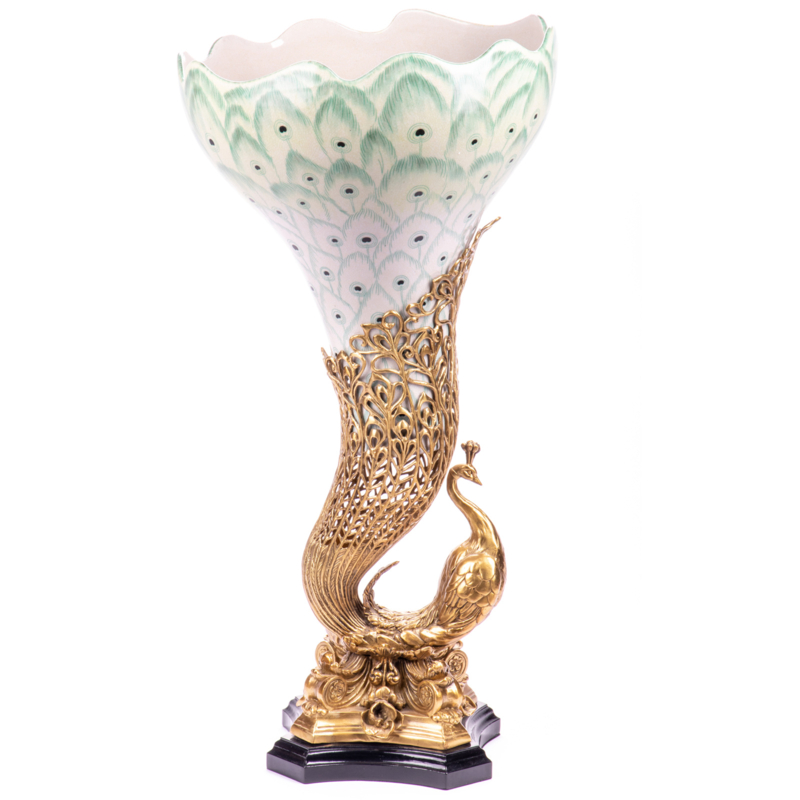 Porselein bronzen pauwvaas is een grote vaas met pauwveer afbeelding hangend in een pauwhouder en op zwart marmeren sokkel voor op tafel of dressoir.