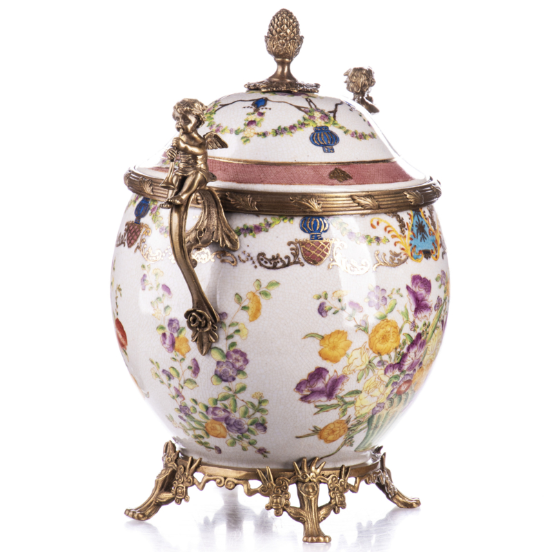 Porselein bronzen bonbonnière met engelen is rijk gedecoreerd en heel romantisch voor een romantische woning een chique hotel of restaurant ter decoratie.